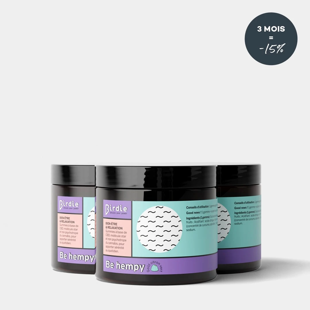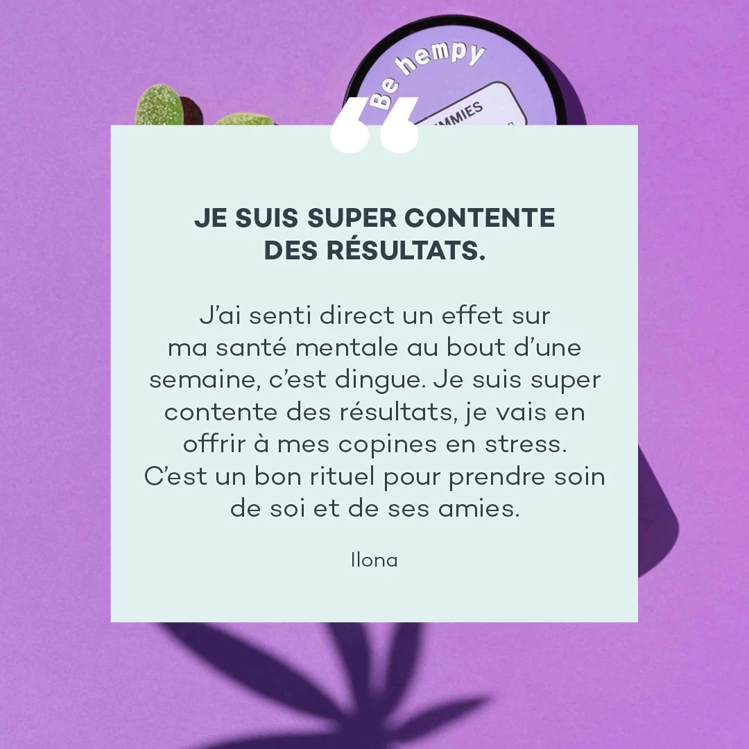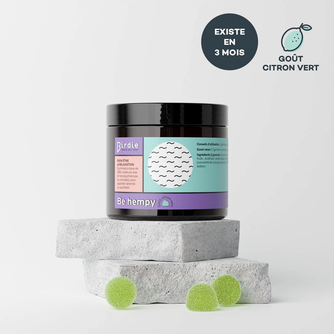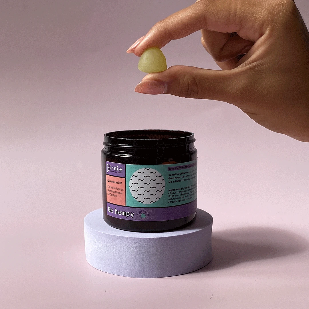 Ingrédients (1 gomme) : Ingrédients (1 gomme) : Sucre de betterave bio ; Sirop de glucose bio ; Eau ; Gélifiant : pectine de fruits ; Acidifiant : acide citrique ; Arôme naturel de citron vert bio ; Denrée alimentaire colorante (concentré de curcuma, spiruline) ; Régulateur d’acidité : citrate de sodium ; Cannabidiol (CBD) 9,9 mg.