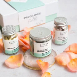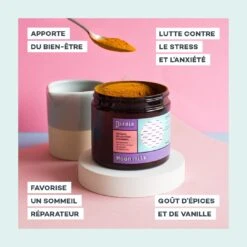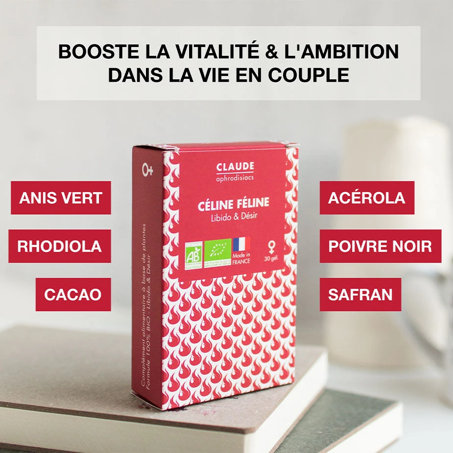 Gélule végétale : HPMC ; Acérola* (fruit) – Malpighia glabra 235,2 mg dont vitamine C (40 mg 50% AR**) ; Extrait d’anis vert* (fruit) – Pimpinella anisum 180 mg (720 mg)*** ; Poivre noir* (graine) – Piper nigrum 180 mg ; Extrait de rhodiole* (racine) – Rhodiola rosea 160 mg ; Cacao* 100 mg ; Extrait de cannelle* (écorce) – Cinnamomum verum 64 mg (128 mg)*** ; Extrait de safran* (stigmate) – Crocus sativus 28 mg dont safranal (0,1 mg).