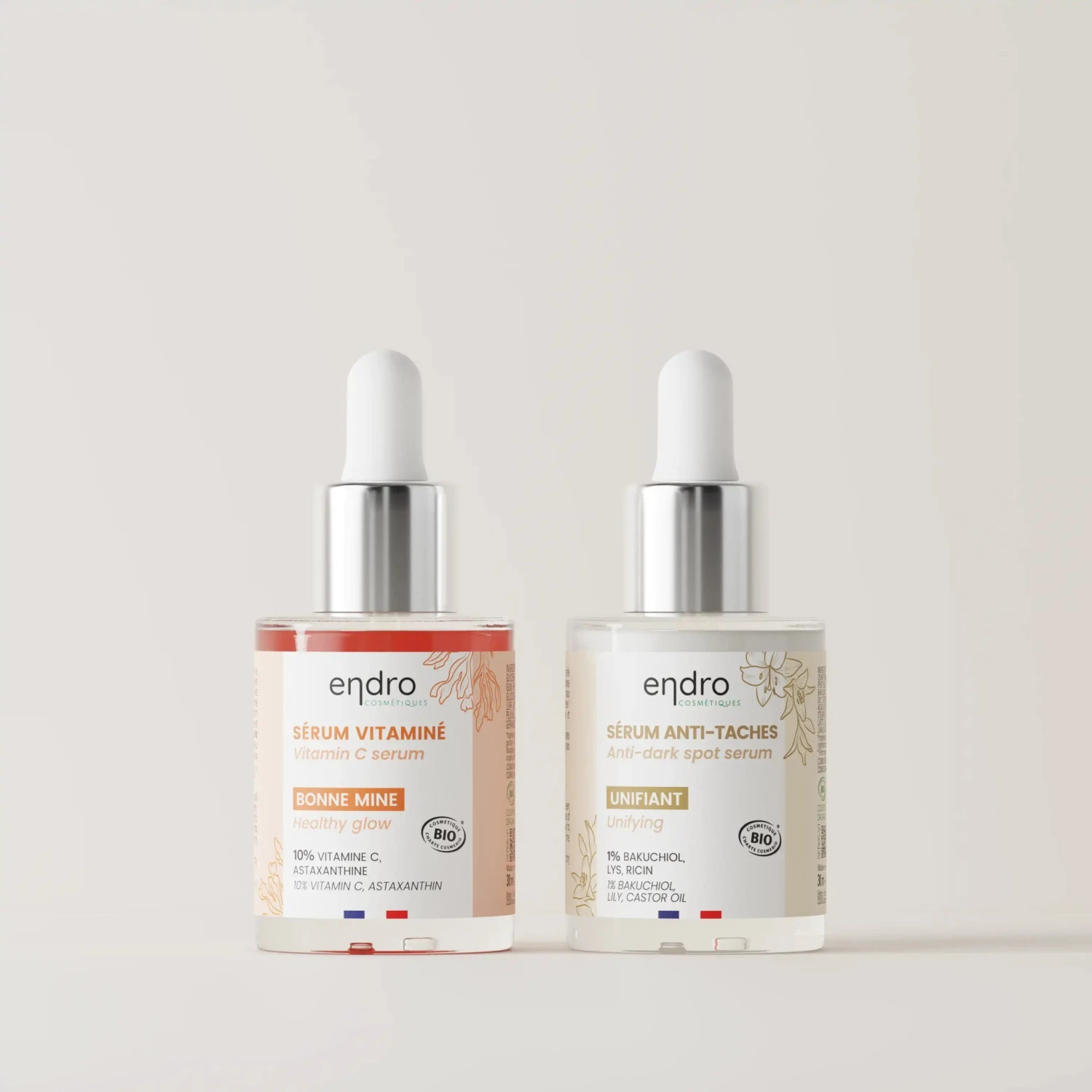L’association de notre sérum Vitaminé enrichi à 10% de vitamine C pure et de notre sérum anti-taches à 1% de bakuchiol permet de retrouver un teint unifié, une peau lumineuse et homogène sans irrégularités. N’attendez plus pour adopter ce duo de choc et retrouvez une peau éclatante de santé. Effet bonne mine et teint unifié assuré !