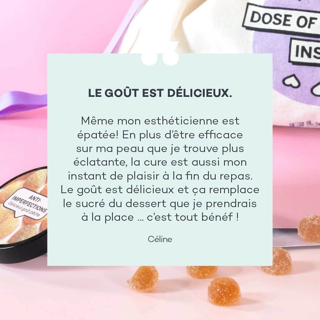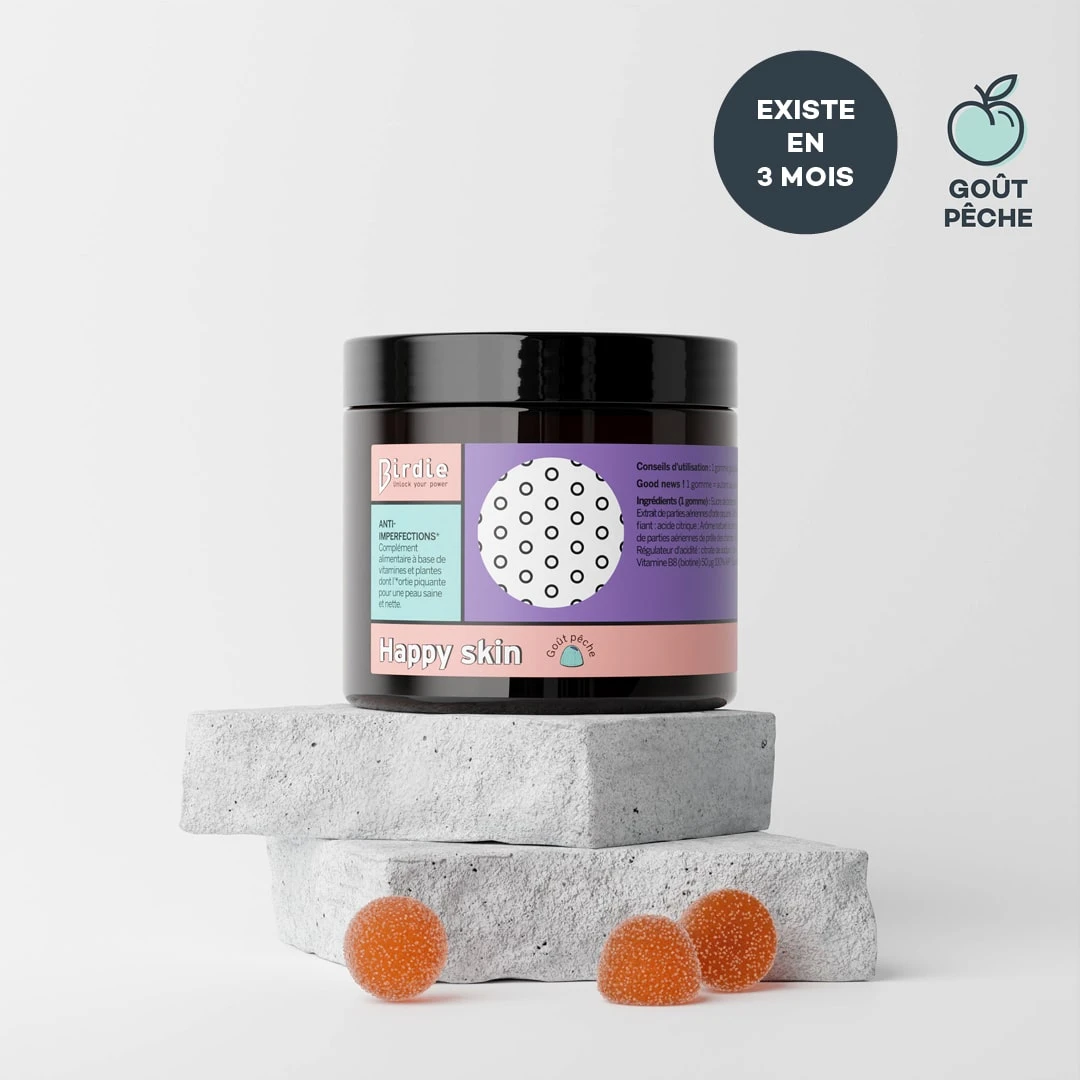 Ingrédients (1 gomme) : Sucre de betterave bio ; Sirop de glucose bio ; Eau ; Gélifiant : pectine de fruits ; Extrait d’ortie 50 mg (EPS¹ 100 mg) titré en polyphénols ; Acidifiant : acide citrique ; Vitamine C 12 mg 15% AR² ; Extrait de prêle des champs 10 mg (EPS¹ 20 mg) dont silice 700 µg ; Régulateur d’acidité : citrate de sodium ; Arôme naturel de pêche bio ; Denrée alimentaire colorante (concentré de paprika et carotte) ; Vitamine B8 50 µg 100% AR².