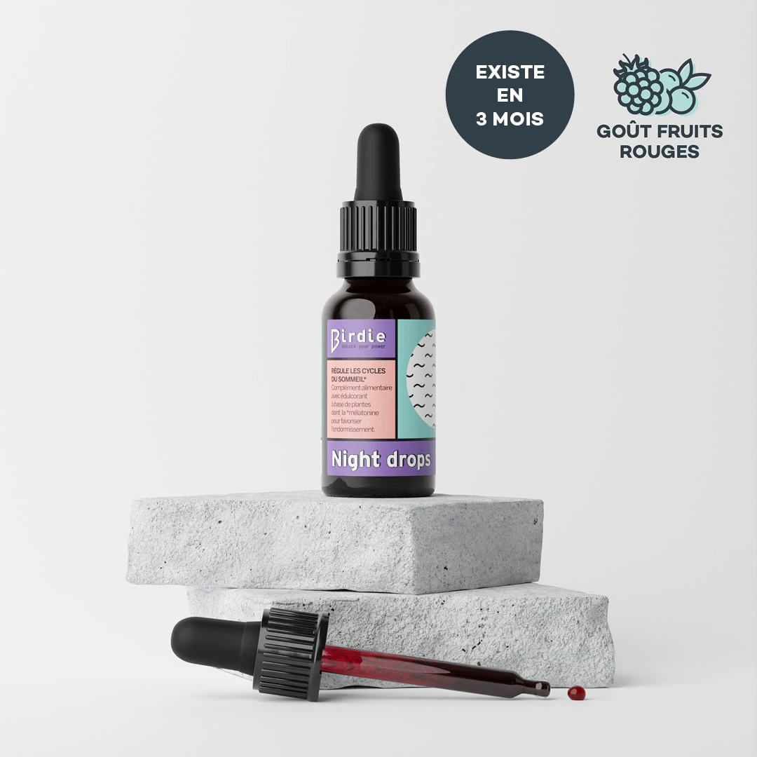 Agent de charge : eau purifiée ; Stabilisant : glycérine ; Colorant naturel : anthocyanes²; Arôme fruits rouges ; Extrait de coquelicot 30 mg (EPS¹ 150 mg) ; Stévia ; Extrait d’aubépine 2,7 mg (EPS¹ 27 mg) ; Acidifiant : acide citrique ; Mélatonine 1 mg ; Conservateurs : sorbate de potassium, benzoate de sodium.