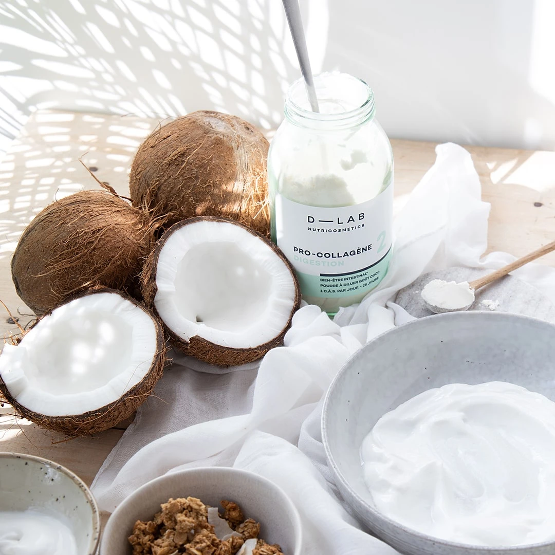 1- Améliore la dégradation protéique et optimise l’assimilation des nutrimentsAfin de permettre une assimilation optimale des nutriments ingérés, des enzymes, comme la papaïne, sont responsables de la dégradation des protéines et/ou lipides, en éléments plus faciles à digérer. Le microbiote intestinal, bien qu’impliqué de manière majoritaire dans la dégradation protéique et la synthèse de vitamines et autres nutriments, est également essentiel dans le développement du système immunitaire. Le collagène, lorsqu’il est ingéré, attire les molécules d’eau grâce à sa nature hydrophile et permet ainsi au bol alimentaire de se déplacer plus facilement dans le tractus gastro-intestinal. Les oligopeptides de collagène et d’élastine, de par leur nature hydrolysée, sont également facilement absorbés au niveau intestinal, afin de garantir un effet complet et une dose suffisante d’acides aminés permettant, comme l’indique notre étude clinique*, la stimulation de la synthèse de collagène et d’élastine. Les prébiotiques tels que les fructo-oligosaccharides sont capables de passer le tube digestif et stimuler la croissance de bactéries bénéfiques telles que les souches Lactobacillus et Bifidobacterium, également présentes dans le Pro-Collagène Digestion. Les prébiotiques sélectionnés ont été scientifiquement prouvés pour, entre autres, réduire la constipation, améliorer l’inconfort intestinal ainsi que contrôler la glycémie.