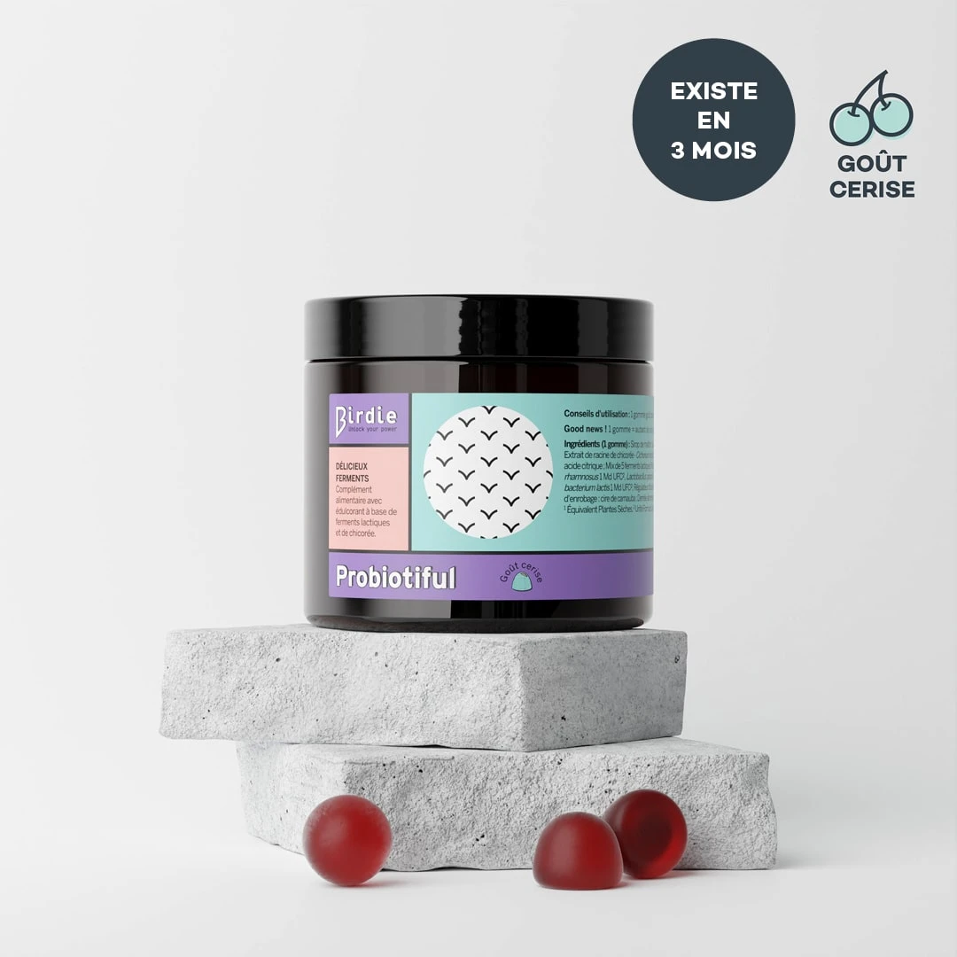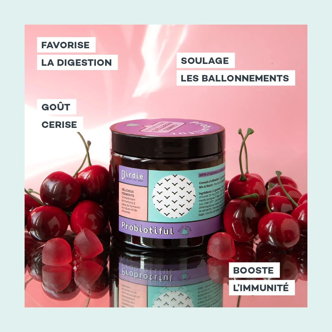 Ingrédients (1 gummy) : Sirop de maltitol ; Eau ; Gélifiant : pectine de fruits ; Acidifiant : acide citrique ; Extrait de racine de chicorée – Cichorium intybus 50 mg (EPS1 : 350 mg) titré en inuline 10 mg ; Mix de 5 ferments lactiques 5 Mds UFC² : Lactobacillus plantarum 1 Md UFC², Lactobacillus rhamnosus 1 Md UFC², Lactobacillus paracasei 1 Md UFC², Bifidobacterium bifidum 1 Md UFC², Bifidobacterium lactis 1 Md UFC²; Régulateur d’acidité : citrate de sodium ; Arôme naturel de cerise bio ; Agent d’enrobage : cire de carnauba ; Denrée alimentaire colorante (concentré de carotte et cassis).