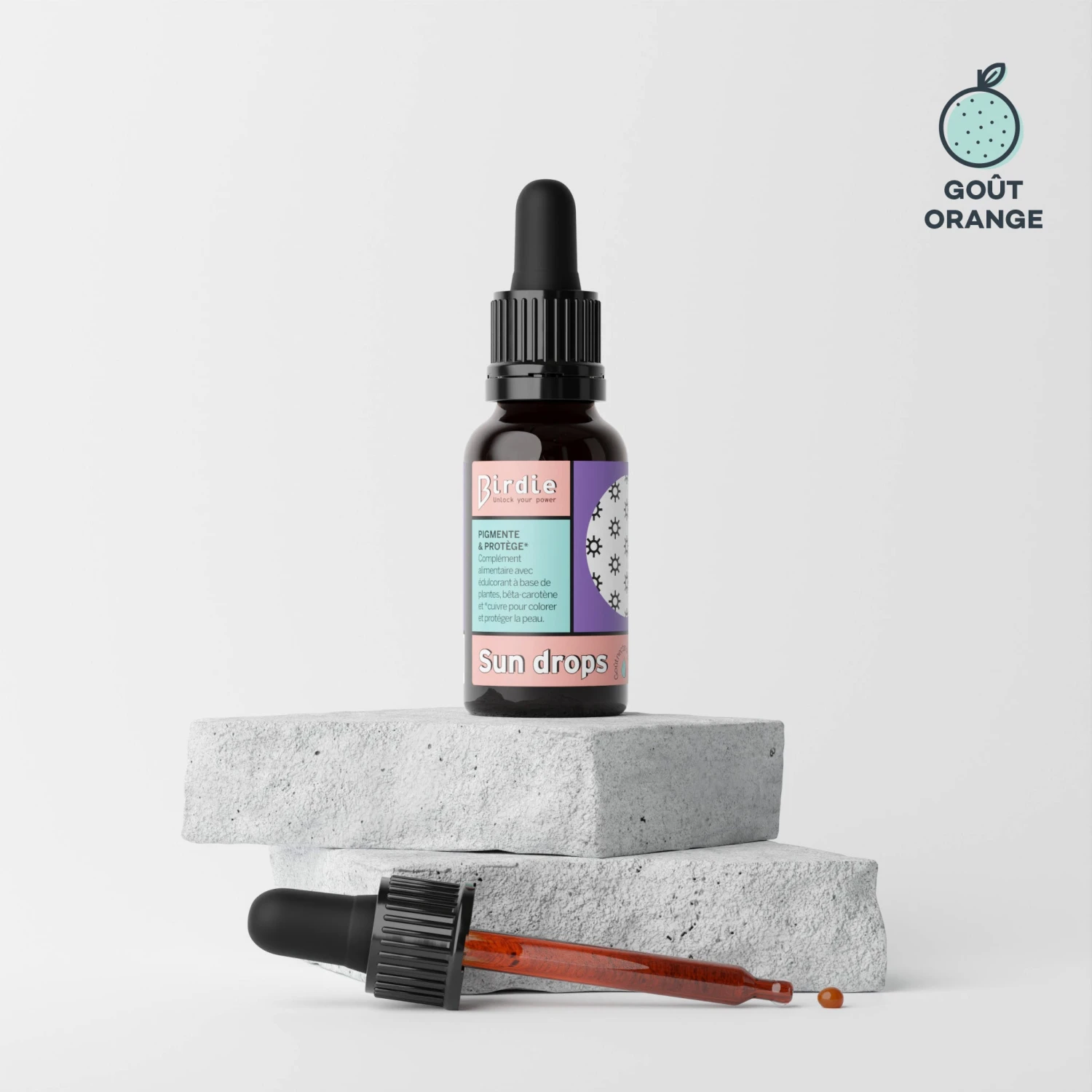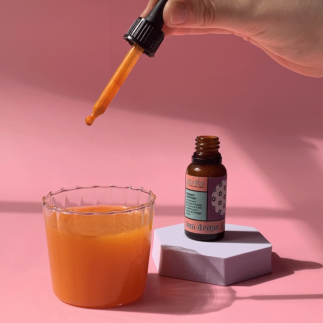 Pour 1 dose (17 gouttes) : Agent de charge : eau purifiée ; Stabilisant : glycérine ; Bêta-carotène 5 mg ; Arôme naturel : nectar de pêche ; Extrait de grenade 30 mg (EPS¹ 450 mg) titré en punicalagines ; Extrait de microalgue Haematococcus pluvialis 23,3 mg dont Astaxanthine 0,7 mg ; Gluconate de cuivre 7,14 mg dont cuivre 1 mg 100% VNR² ; Stevia ; Acidifiant : acide citrique ; Conservateurs : sorbate de potassium, benzoate de sodium.