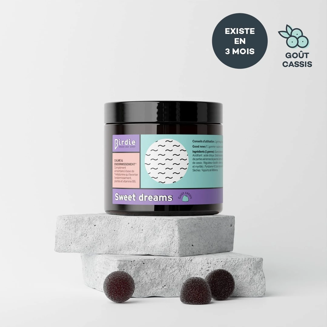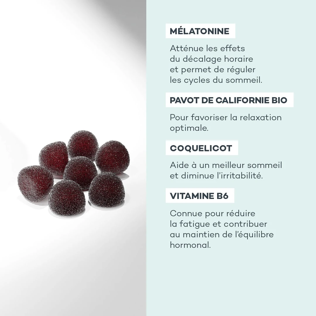 INGRÉDIENTS (1 GOMME) : Sucre de betterave bio ; Eau ; Sirop de glucose bio ; Gélifiant : pectine de fruits ; Acidifiant : acide citrique ; Extrait de pétale de coquelicot – Papaver rhoeas 25 mg (EPS1 125 mg) ; Extrait de parties aériennes de pavot de Californie – Eschscholzia californica 25 mg (EPS1 100 mg) ; Arôme naturel de cassis ; Régulateur d’acidité : citrate de sodium ; Denrée alimentaire colorante (concentré de carotte et myrtille) ; Pyridoxine HCl dont vitamine B6 1,4 mg 100% AR2 ; Mélatonine 1,9 mg.