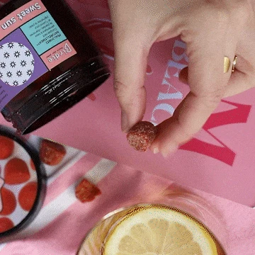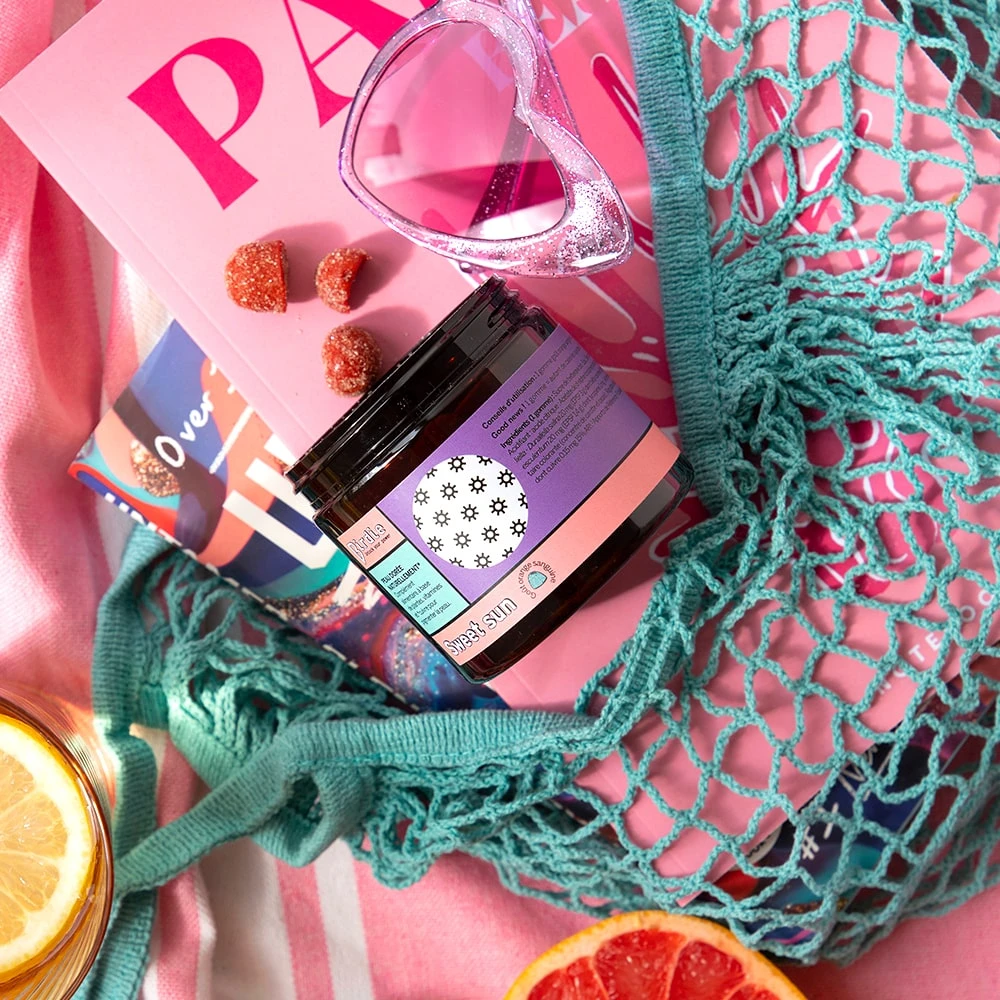 Sucre de betterave bio ; Eau ; Sirop de glucose bio ; Gélifiant : pectine de fruits ; Acidifiant : acide citrique ; Acetate de d-alpha-tocopheryl dont vitamine E 6 mg 50% AR1 ; Extrait de dunaliella – Dunaliella salina 20 mg (EPS2 3 g) dont bêta-carotène 2 mg ; Extrait de fruit de tomate – Lycopersicon esculentum 20 mg (EPS2 1,4 g) dont lycopène 2 mg ; Arôme naturel d’orange sanguine ; Denrée alimentaire colorante (concentré de carotte et cassis) ; Régulateur d’acidité : citrate de sodium ; Citrate de cuivre dont cuivre 0,15 mg 15% AR1.