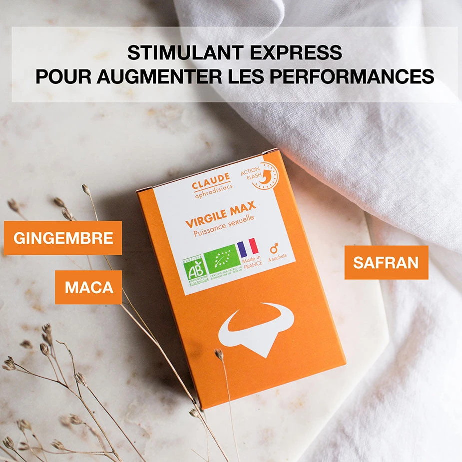 Pour 1 sachet : Extrait sec de Gingembre BIO* 2/1 / Zingiber ofcinale Roscoe (rhizome) : 2,25g ; Extrait sec de Maca BIO* 1/1 / Lepidium meyenii Walp (racine) : 1,5g Extrait sec de Safran BIO* / Crocus sativus L. (stigmate) : 28 mg.